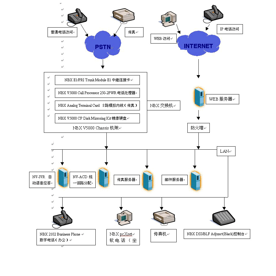 北京晨報的客戶服務(wù)中心項目是一個集呼叫中心與辦公系統(tǒng)于一體的語音、數(shù)據(jù)服務(wù)平臺。通過一條E1中繼線與外部電話網(wǎng)相聯(lián)。內(nèi)部使用50部數(shù)字電話進(jìn)行處理辦公業(yè)務(wù),10個呼叫中心坐席采用計算機的軟電話(pcXset)實現(xiàn)與客戶的交談,傳真服務(wù)器通過NBX所提供的8條模擬內(nèi)線與外界互通。