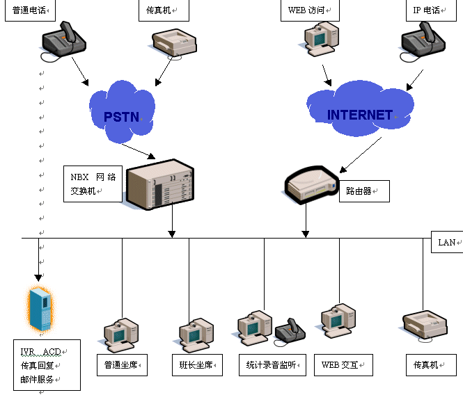 基于NBX的呼叫中心對外支持PSTN、IP兩種接入方式,可以實現(xiàn)各種接入:普通電話、傳真、IP電話、郵件、WEB訪問,NBX呼叫中心在技術(shù)上實現(xiàn)革命性的突破,在內(nèi)部實行語音數(shù)據(jù)兩網(wǎng)合一,將外部的模擬數(shù)據(jù)轉(zhuǎn)換為以太網(wǎng)數(shù)據(jù)包,由NV-ACD實現(xiàn)外部各種訪問的統(tǒng)一路由分配。