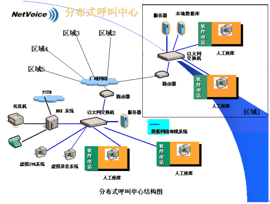 由于代理技能差異、語言差異、呼叫量的差異,以及客戶中心客戶所在地的變化及每個客戶對各自所擁有的用戶資料的保密性需求,分布式呼叫中心往往更適合各類企業(yè)的實際。分布式呼叫中心的建立,意味著需要在多個分中心之間進行統(tǒng)一的呼叫控制及語音與同步數(shù)據(jù)轉(zhuǎn)移。NBX網(wǎng)絡(luò)交換機的引入,兩網(wǎng)合一的特性使分布式呼叫中心的建立成為了一件非常容易的事情。呼叫中心可以擴展到多個位于不同地域的局域網(wǎng)上,通過路由選擇可以自動地把呼叫(