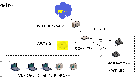 隨著信息時代的來臨,電話、電腦成了辦公領(lǐng)域的重要工具,人們在辦公室通過計算機網(wǎng)絡(luò)共享數(shù)據(jù)資源、傳遞數(shù)據(jù)信息,彼此間通過電話言語溝通。在人們享受到高科技帶來的高效率的同時,也感到一些不便,例如計算機網(wǎng)絡(luò)、電話網(wǎng)都需要單獨鋪設(shè)專用的線路,線路的變更往往是讓人心煩的事情。隨著各公司推出無線局域網(wǎng)絡(luò)解決方案(AirConnect)和NBX網(wǎng)絡(luò)電話交換機平臺的推出,通過無線局域網(wǎng)絡(luò)技術(shù),語音、數(shù)據(jù)兩網(wǎng)合一技術(shù),將電腦、電話機合二為一,同時從線路的束縛中解放出來。人們再也不用擔(dān)心布線問題,可以隨處移動辦公,享受無線網(wǎng)絡(luò)、無線話音,大大提高人們的辦公效率。
