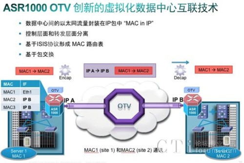 Cisco OTV技術(shù)可以為跨任意傳輸網(wǎng)絡(luò)的二層連接擴展,提供運營優(yōu)化型解決方案。因此,OTV對于分布式數(shù)據(jù)中心的高效部署發(fā)揮著關(guān)鍵作用,有助于實現(xiàn)應(yīng)用可靠性和靈活的工作負(fù)載遷移。OTV是一項“MAC in IP”技術(shù)。通過使用MAC地址路由規(guī)則,OTV可提供一種疊加(overlay)網(wǎng)絡(luò),能夠在分散的二層域之間實現(xiàn)二層連接,同時保持這些域的獨立性以及IP互聯(lián)的容錯性、永續(xù)性和負(fù)載均衡優(yōu)勢。 圖1說明了這種工作機制。