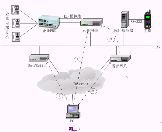 用戶使用系統(tǒng)時(shí),需要先下載終端并安裝到PC上,然后在終端上撥企業(yè)內(nèi)部的分機(jī)號(hào)碼就可以了。對(duì)于一般的企業(yè),VoIP語(yǔ)音網(wǎng)關(guān)可以配置幾條模擬線到一個(gè)E1的規(guī)模,SoftSwitch、語(yǔ)音網(wǎng)關(guān)、應(yīng)用服務(wù)器可以安裝在一臺(tái)PC或PC服務(wù)器上,或者與企業(yè)的其它服務(wù)器(如代理服務(wù)器)合用,另外需要一到兩個(gè)公網(wǎng)IP地址資源。系統(tǒng)的硬件和網(wǎng)絡(luò)成本非常低,整個(gè)系統(tǒng)如果按一個(gè)E1(30路)容量計(jì)算,配置VoIP網(wǎng)關(guān)和一臺(tái)PC服務(wù)器,硬件價(jià)格不超過(guò)3萬(wàn)元,如果VoIP網(wǎng)關(guān)支持隧道模式傳送信令和語(yǔ)音,則語(yǔ)音網(wǎng)關(guān)也可以省去。