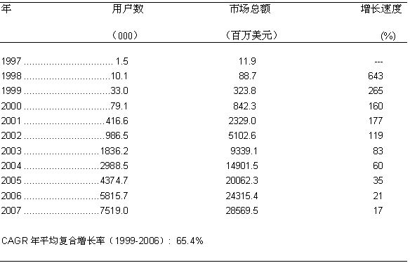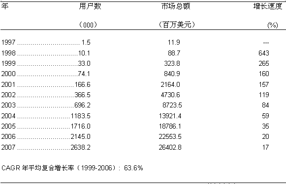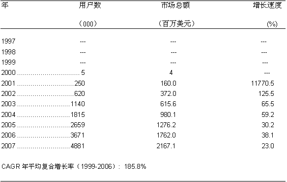 圖一: 美國(guó)寬帶無(wú)線(xiàn)固定接入市場(chǎng)的增長(zhǎng)歷史和預(yù)測(cè) 1997-2007
