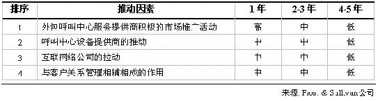 表二羅列了推動中國外包呼叫中心服務(wù)市場發(fā)展的主要因素。