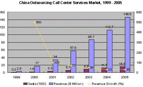 Frost & Sullivan公司研究表明在2000年,中國外包呼叫中心服務(wù)市場價值1700萬美元,共有1600坐席。本座席數(shù)是按照實(shí)際工作量來計算的,物理上存在的坐席數(shù)要超過2300個。因?yàn)樵S多坐席是在2000年下半年末才建成投入使用的,并且工作任務(wù)也沒有滿負(fù)荷。
