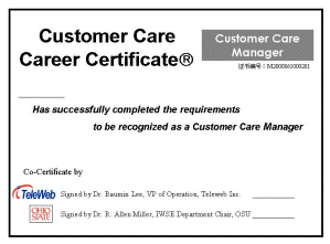 學(xué)員在經(jīng)過完整的課程培訓(xùn)之后,經(jīng)考試合格,可以獲得由美國俄亥俄州立大學(xué)與太維資訊有限公司聯(lián)合頒發(fā)的的專業(yè)培訓(xùn)證書。客戶服務(wù)中心認(rèn)證的目的有兩個(gè):首先,對(duì)于已經(jīng)在客服中心從業(yè)的人員,太維公司的培訓(xùn)可以提供一個(gè)提升他們工作能力的機(jī)會(huì),通過培訓(xùn)后不同層次的專業(yè)培訓(xùn)認(rèn)證,太維公司以行業(yè)的標(biāo)準(zhǔn)要求對(duì)他們的提升加以證明,以加強(qiáng)他們?cè)谛袠I(yè)中的競爭能力。其次,對(duì)于有志致力于在客戶服務(wù)行業(yè)從業(yè)的人事,太維公司廣泛深入、滿足各種需求的專門技術(shù)培訓(xùn)與相應(yīng)的不同層次的認(rèn)證,為他們進(jìn)入該行業(yè)提供一個(gè)標(biāo)準(zhǔn)的素質(zhì)證明,以使他們能夠順利勝任客戶服務(wù)中心的各種主要的工作職位。