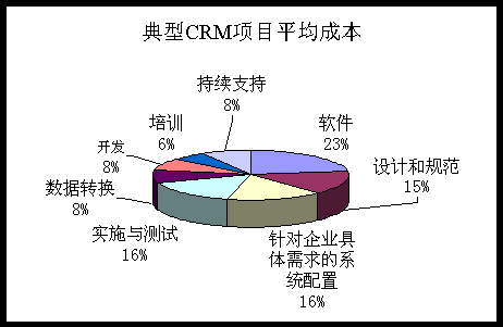 在企業(yè)確定了符合需求的CRM解決方案,包括軟件、供應(yīng)商以及技術(shù)性能之后,仍然有很多其他因素值得考慮。最主要的因素之一即成本。典型的項目的預(yù)算成本中軟件成本占1/3,咨詢、實(shí)施和培訓(xùn)成本占2/3。如下圖所示: