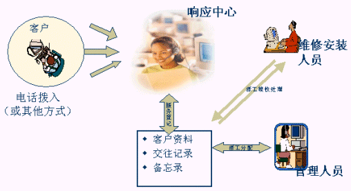 談起客戶(hù)服務(wù)部門(mén)的流程管理,我想許多有過(guò)這方面經(jīng)驗(yàn)的人可能會(huì)覺(jué)得頭大,因?yàn)樗婕碍h(huán)節(jié)多,如派工、配件管理、人員管理、總部對(duì)分公司的管理等等。因此,在服務(wù)管理系統(tǒng)中,就提供了一種自動(dòng)化的流程管理,涵概了服務(wù)部門(mén)的所有業(yè)務(wù)應(yīng)用,包含了客戶(hù)響應(yīng)處理、服務(wù)派工管理、配件管理、員工管理以及總部對(duì)分公司的管理等,迅速構(gòu)架公司總部與各地分公司溝通渠道,解決總部與分公司信息流轉(zhuǎn)的問(wèn)題。下圖反應(yīng)了服務(wù)流程管理過(guò)程。