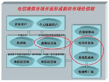 在電信增值市場開放的背景之下,新的市場價值鏈正在形成(如圖所示)。國內(nèi)電信建設(shè)轟轟烈烈的大規(guī)模基礎(chǔ)設(shè)施投資已是明日黃花,改善應(yīng)用“稀缺”的現(xiàn)狀才是當(dāng)務(wù)之急。李峻認(rèn)為,信息產(chǎn)品技術(shù)服務(wù)提供商最主要的任務(wù),就是幫助運營商開發(fā)針對中國市場的增值業(yè)務(wù),并帶動其主業(yè)協(xié)同發(fā)展。即面向電信網(wǎng)絡(luò)運營商以及虛擬運營商,提供增值業(yè)務(wù)系統(tǒng)整體解決方案及其軟硬件支撐平臺和應(yīng)用系統(tǒng)。