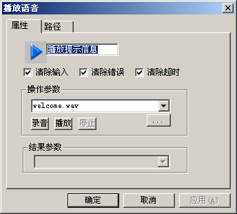 · 失敗 // 操作失敗。如播放語(yǔ)音時(shí)語(yǔ)音文件不存在,或進(jìn)行數(shù)據(jù)庫(kù)操作,外部程序調(diào)用,取系統(tǒng)參數(shù),讀數(shù)字,進(jìn)行運(yùn)算操作,取子串,TTS播放語(yǔ)音時(shí),由于具體設(shè)置不完善或不準(zhǔn)確而導(dǎo)致失敗,等等。