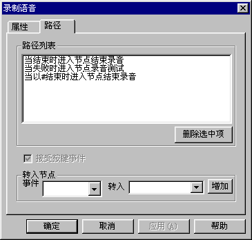 有兩種方式,一種是通過(guò)ZingServ的錄制語(yǔ)音模塊來(lái)靈活設(shè)置錄音的起點(diǎn)、終點(diǎn)和錄音長(zhǎng)度,如客戶投訴和客戶建議大都通過(guò)這種方式來(lái),這時(shí)錄音文件的名稱(chēng)可以使用自定義變量,便于在二次開(kāi)發(fā)中使用。