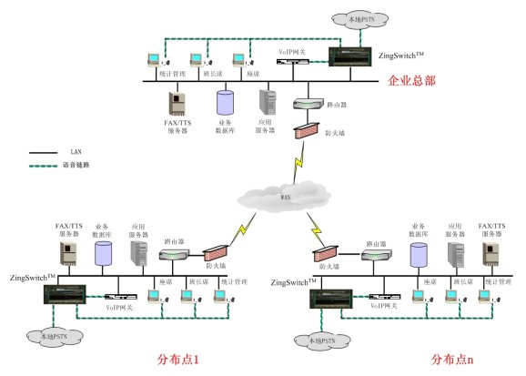 - 系統(tǒng)仍可同時(shí)在總部設(shè)立VoIP中心,用以實(shí)現(xiàn)數(shù)據(jù)和管理的集中,并且采用VoIP的方式,對(duì)各分布點(diǎn)的話務(wù)工作進(jìn)行集中的監(jiān)控。