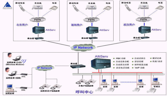 AltiCenter 將奧迪堅(jiān)所倡導(dǎo)的基于IP分布式呼叫中心技術(shù)完美轉(zhuǎn)化為產(chǎn)品,為用戶輕松構(gòu)建基于IP的分布式呼叫中心系統(tǒng)。該呼叫中心不僅提供語(yǔ)音電話,還能提供包括音頻視頻在內(nèi)的多媒體通信;不僅能支持傳統(tǒng)的電話終端,還能支持來自Internet的語(yǔ)音、數(shù)據(jù)信息等多種交互方式;不僅提供了完整的本地座席功能,還提供遠(yuǎn)程IP座席,遠(yuǎn)程IP專家座席,并提供高度統(tǒng)一實(shí)用的呼叫中心管理體系。AltiCenter在設(shè)計(jì)之初就采用IP內(nèi)核的一體化設(shè)計(jì),不需要任何語(yǔ)音網(wǎng)關(guān)設(shè)備,就可以在網(wǎng)絡(luò)上構(gòu)建一個(gè)語(yǔ)音和數(shù)據(jù)的統(tǒng)一平臺(tái),無論在世界的哪個(gè)角落,遠(yuǎn)程IP座席和分布的異地機(jī)構(gòu)都可以共享客戶的所有資源(語(yǔ)音、數(shù)據(jù)、座席),由于采用了先進(jìn)的VoIP技術(shù),可以為各地的電話和Internet的客戶提供統(tǒng)一的客戶號(hào)碼和統(tǒng)一的客戶服務(wù),并極大地降低呼叫中心的運(yùn)營(yíng)成本,真正幫助用戶建立一個(gè)高效的、信息共享的分布式呼叫中心系統(tǒng)。