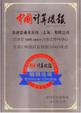奧迪堅(jiān)基于IP分布式呼叫中心平臺(tái)榮獲中國計(jì)算機(jī)報(bào)2003年度編輯推薦獎(jiǎng)。《中國計(jì)算機(jī)報(bào)》(CIW-China