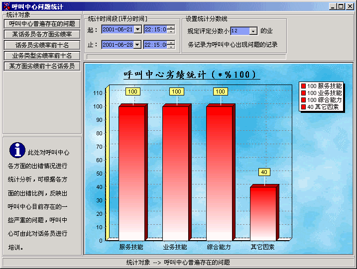 下圖為AP Suite的呼叫中心劣績(jī)統(tǒng)計(jì)圖,通過(guò)此統(tǒng)計(jì)可以了解到呼叫中心目前存在的一些問(wèn)題,從而對(duì)話務(wù)員進(jìn)行針對(duì)性的培訓(xùn)。