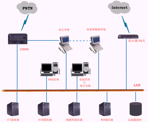 LTD4000客戶服務中心主要由LTD-09可編程智能語音交換機、業(yè)務代表座席、CTI服務器、數(shù)據(jù)庫服務器、WEB服務器、管理監(jiān)控工作站和網(wǎng)絡連接設備等部分組成。