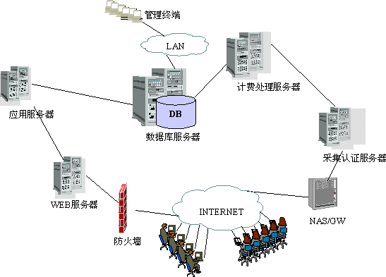 根據(jù)以上體系結(jié)構(gòu),寬帶IP城域網(wǎng)計費與業(yè)務管理系統(tǒng)的運行平臺結(jié)構(gòu)如圖所示: