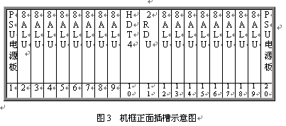見圖2和3,遠(yuǎn)端模塊采用19英寸標(biāo)準(zhǔn)機框,高度為5U,可安裝在各種標(biāo)準(zhǔn)的19英寸的機柜中。機框共20個插槽,正面插板,反面背板出線。每個機框可插20塊各種類型的板件,其中兩邊第1第20槽固定插電源板PSU,中間第10號槽固定插數(shù)字中繼接口板HDT4,其余16個槽為通用槽口,可插16塊各種類型接口板。每塊板為8路,一個機框總共128話路。調(diào)度接口板2RDU固定插第11槽,該板不占機框端口。對于自帶交換系統(tǒng),需要安裝一塊系統(tǒng)信號音板8TDU,該板固定插19槽,占8個端口。