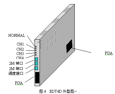 EDT4D是在舊EDT4板上增加調(diào)度接口。見圖4,EDT4D為一塊H20-20交換機插板,厚度為兩個槽口。EDT4通過扁平電纜與交換機公共控制機柜的背板PGA相連,提取交換機時隙;并將時隙轉(zhuǎn)換為由四個數(shù)字中繼接口E1組成的準(zhǔn)V5.2接口與遠(yuǎn)端模塊相連。一塊EDT4可接2個PGA端口組,共128個話路。