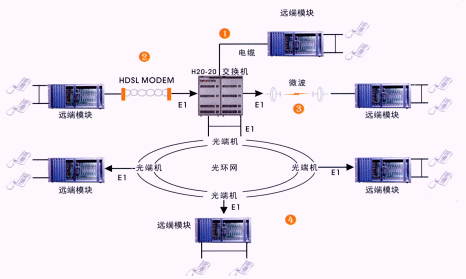 遠(yuǎn)端模塊通過標(biāo)準(zhǔn)2M(E1)接口與交換機連接。該接口不受傳輸距離和傳輸設(shè)備的限制。常用的傳輸設(shè)備有SDH、PDH光端機(光纜),數(shù)字微波、數(shù)字?jǐn)U頻,HDSL調(diào)制解調(diào)器(雙絞線)等。