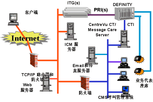 Internet呼叫中心(Internet Call Center簡(jiǎn)稱(chēng)ICC)是當(dāng)前的一個(gè)明顯趨勢(shì)。支持因特網(wǎng)作為呼叫中心的訪(fǎng)問(wèn)渠道會(huì)極大增強(qiáng)呼叫中心的可用性。Internet用戶(hù)可以通過(guò)主頁(yè)瀏覽、電子郵件、在線(xiàn)Chat、IP語(yǔ)音電話(huà)等方式與話(huà)務(wù)員建立在線(xiàn)聯(lián)系,得到優(yōu)質(zhì)的服務(wù)。AVAYA的Internet呼叫中心解決方案支持用戶(hù)采用一條電話(huà)線(xiàn)進(jìn)行因特網(wǎng)和IP電話(huà)的訪(fǎng)問(wèn),ICM管理器與Web服務(wù)器建立連接,將到來(lái)的IP呼叫進(jìn)行自動(dòng)分配,ITG IP電話(huà)網(wǎng)關(guān)實(shí)現(xiàn)將IP語(yǔ)音流轉(zhuǎn)換成語(yǔ)音信號(hào),經(jīng)E1線(xiàn)送到Definity交換機(jī)后傳到話(huà)務(wù)員座席。座席和用戶(hù)可實(shí)現(xiàn)瀏覽器同步等功能。