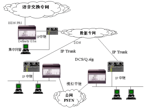 隨著IP網(wǎng)絡(luò)技術(shù)的不斷發(fā)展,數(shù)據(jù)網(wǎng)絡(luò)的融合能力越來(lái)越強(qiáng)。AVAYA在全球范圍內(nèi)率先推出全面符合H.323標(biāo)準(zhǔn)的VoIP解決方案及基于IP中繼的DCS/Q.sig專(zhuān)網(wǎng)透明功能信令。通過(guò)IP中繼將公司全部分支包括機(jī)構(gòu)的DEFINITY交換機(jī)進(jìn)行連接,同樣可以提供全面的專(zhuān)網(wǎng)透明功能和網(wǎng)絡(luò)呼叫中心應(yīng)用,DEFINITY IP中繼可提供豐富的語(yǔ)音壓縮能力,從64Kbps的無(wú)壓縮傳輸?shù)?Kbps的經(jīng)濟(jì)傳輸方案均可提供,同時(shí)通過(guò)復(fù)用在IP包中的DCS/Q.sig信令提供透明功能。