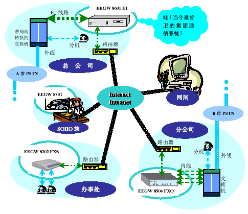 - 在IP網(wǎng)內(nèi)建立智能交換中心完成兩個異質(zhì)網(wǎng)PSTN網(wǎng)和數(shù)據(jù)網(wǎng)在本地異地的集成