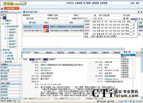 管理好客戶,做好客戶資料的詳細(xì)管理;管理企業(yè)各部門與客戶交往的所有日程活動。讓查閱者一目了然。并可以對客戶進行精準(zhǔn)營銷,如群發(fā)短信、群發(fā)傳真、群發(fā)郵件等。