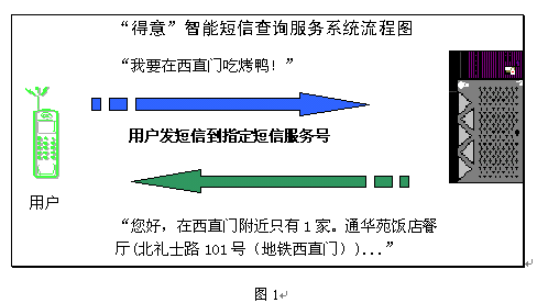 智能短信服務(wù),就是允許短信用戶在手機上直接以自然語言的形式輸入文字(而不是輸入復(fù)雜的代碼或操作繁瑣的菜單),系統(tǒng)能迅速、準(zhǔn)確地理解用戶的意思,提供周到的信息和服務(wù)。短信服務(wù)商可根據(jù)具體應(yīng)用領(lǐng)域定制一系列全新的智能短信業(yè)務(wù),如旅游交通、餐飲娛樂、金融證券、交友網(wǎng)聚、智力競猜等受歡迎的服務(wù),將直接刺激用戶使用短信服務(wù)的興趣和頻率。得意公司提供的北京餐飲智能短信服務(wù)可以靈活、方便地引導(dǎo)用戶找到合適的餐飲信息(圖1)