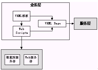 Scripts(ASP,JSP等)語言訪問外部系統(tǒng)以獲取數(shù)據(jù),把這些數(shù)據(jù)合并到VXML的模板中,形成完整的業(yè)務(wù)流程。服務(wù)層獲得該業(yè)務(wù)流程后,就可以按照該流程和用戶進(jìn)行交互。