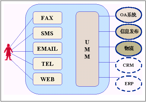 ·UMM(Uni Message Manager ) 統(tǒng)一消息管理,它有兩個(gè)任務(wù),一個(gè)是根據(jù)外部傳過來信息的不同,交給后臺(tái)不同的信息處理系統(tǒng)處理,另一個(gè)是將后臺(tái)不同的信息處理系統(tǒng),根據(jù)需要通過不同的媒介發(fā)布給用戶