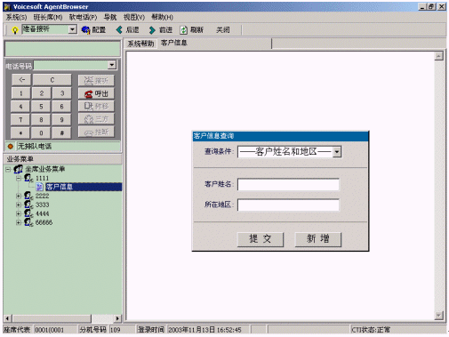 ·語音數(shù)據(jù)同步:當(dāng)電話轉(zhuǎn)到該座席上時(shí),業(yè)務(wù)界面中將根據(jù)用戶的電話號(hào)碼以及操作信息,提示座席客戶資料