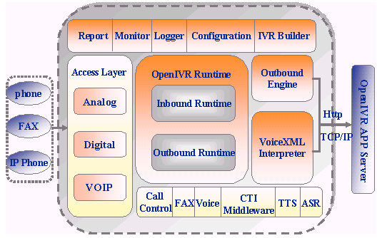 OpenIVR通過(guò)了業(yè)界主要的CTI中間件和PBX集成測(cè)試,是呼叫中心系統(tǒng)IVR服務(wù)器的理想選擇;而集成商只需簡(jiǎn)單掌握VoiceXML語(yǔ)言,就可以方便地定制業(yè)務(wù)及流程;下面是 OpenIVR系統(tǒng)結(jié)構(gòu)圖: