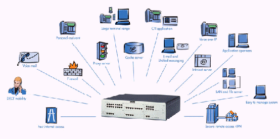 - 一體化:將多項(xiàng)功能集成到一個(gè)單一設(shè)備中,這些包括:因特網(wǎng)接入、E-mail服務(wù)器、局域網(wǎng)、計(jì)算機(jī)電話集成(CTI)、呼叫管理(嵌入式個(gè)人助理及語音信箱,內(nèi)部移動(dòng)通信等)。