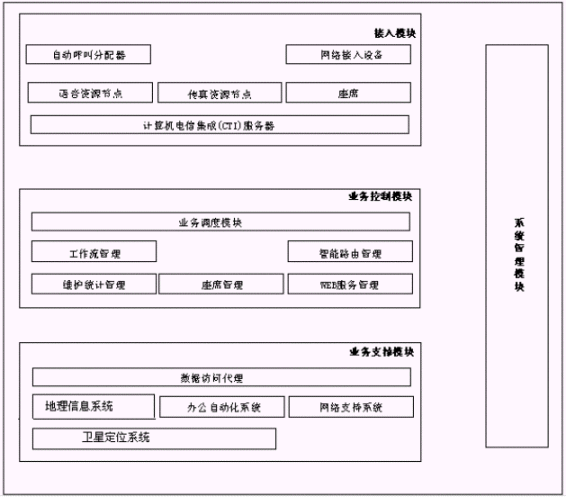 博宇110自動報(bào)警與指揮調(diào)度系統(tǒng)的邏輯結(jié)構(gòu)由以下四大模塊構(gòu)成:接入模塊、業(yè)務(wù)控制模塊、業(yè)務(wù)支撐模塊、系統(tǒng)管理模塊,如下圖所示。其中,接入模塊、業(yè)務(wù)控制模塊和業(yè)務(wù)支撐模塊構(gòu)成了整個系統(tǒng)軟件體系結(jié)構(gòu)的三個層次,而系統(tǒng)管理模塊則橫貫始終。