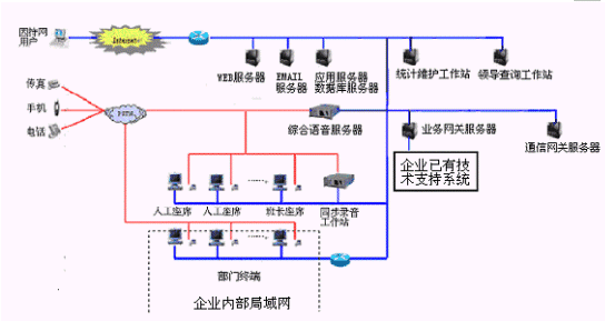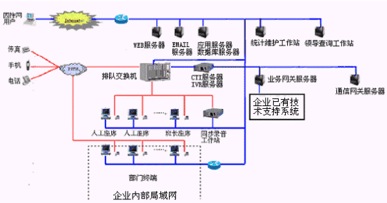 本系統(tǒng)物理結構由帶語音板卡的工控機或排隊交換機、CTI服務器、IVR(交互式語音應答)/IFR(交互式傳真應答)服務器、業(yè)務代表座席(邏輯上分為:普通業(yè)務代表座席、專家座席等)、班長座席、統(tǒng)計維護管理工作站、因特網(WEB)服務器、電子郵件(EMAIL)服務器、數據庫/應用服務器、錄音留言工作站、領導查詢工作站、業(yè)務網關服務器、通信網關、網絡系統(tǒng)等構成。