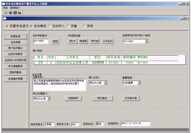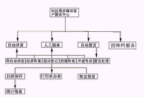 企業(yè)或個人打入電話后,可以選擇人工服務(wù),同座席話務(wù)人員直接溝通,由話務(wù)人員將企業(yè)或個人反映的問題和提出的建議意見記錄下來,并同時記錄下該客戶的聯(lián)系方式,將相關(guān)數(shù)據(jù)添加入系統(tǒng)數(shù)據(jù)庫;也可以在數(shù)據(jù)庫的支持下回答企業(yè)或個人對科技成果和政策法規(guī)的咨詢和疑問。企業(yè)或個人也可以選擇自動語音服務(wù)方式,根據(jù)系統(tǒng)的語音提示輸入按鍵,選擇類別,將自己的投訴和建議以及自己的聯(lián)系方式信息以留言錄音的方式保存在系統(tǒng)中。系統(tǒng)同時還支持自動傳真方式,企業(yè)或個人可以通過傳真機(jī)打通客戶服務(wù)中心,通過按鍵選擇傳真方式,將自己的意見建議等的文本內(nèi)容傳真給系統(tǒng),系統(tǒng)自動接受并存入數(shù)據(jù)庫。