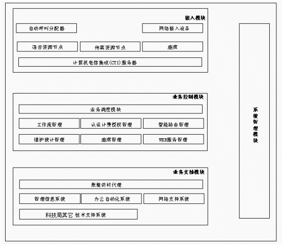 系統(tǒng)管理模塊提供對全系統(tǒng)完善的設(shè)備管理、網(wǎng)絡(luò)管理、運(yùn)營維護(hù)管理、服務(wù)質(zhì)量管理、業(yè)務(wù)信息管理及決策分析等功能,幫助科技局客戶服務(wù)中心運(yùn)營者用好系統(tǒng),把握市場動態(tài),不斷提高服務(wù)質(zhì)量。