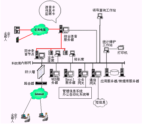應(yīng)用現(xiàn)代先進(jìn)的CTI技術(shù)建立的科技局公開電話系統(tǒng),改變了傳統(tǒng)的科技局辦公的一部電話、一支筆、一個本(或用計(jì)算機(jī)當(dāng)打字機(jī))的記錄、交流模式。在充分利用各級科技局現(xiàn)有辦公自動化系統(tǒng)基礎(chǔ)上,通過共享科技局、社會網(wǎng)絡(luò)資源,能夠?yàn)槠髽I(yè)或個人提供了更多、更好、更便捷的服務(wù)。
