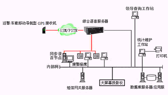 博宇科技110無線報警定位調(diào)度系統(tǒng)指揮調(diào)度中心的物理結(jié)構(gòu)由帶語音板卡的高性能工控機、CTI服務(wù)器、接警座席、統(tǒng)計維護(hù)管理工作站、數(shù)據(jù)庫服務(wù)器/應(yīng)用服務(wù)器、短消息網(wǎng)關(guān)服務(wù)器、同步數(shù)字錄音工作站、網(wǎng)絡(luò)系統(tǒng)和大屏幕投影儀等以及所開發(fā)的有關(guān)應(yīng)用軟件構(gòu)成。
