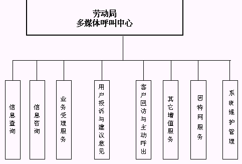 本系統(tǒng)具有自動語音服務、人工坐席服務、信息咨詢、信息查詢、客戶投訴建議、客戶回訪與信息調(diào)查、因特網(wǎng)服務、管理人員對語音記錄的查詢等功能,并且結合圖形化的管理、監(jiān)控界面,使得客戶隨時隨地可以利用身邊的各種通訊工具獲得勞動局的方便快捷的服務。