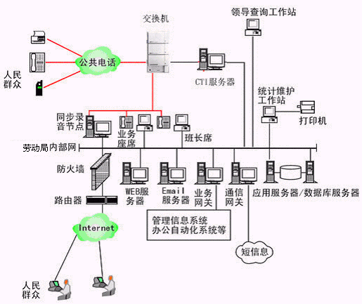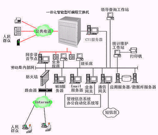 勞動局多媒體呼叫中心系統(tǒng)主要是由智能型可編程交換機或帶語音板卡的工控機或排隊交換機、CTI服務器、IVR(交互式語音應答)/IFR(交互式傳真應答)子系統(tǒng)、人工座席子系統(tǒng)、應用服務器、數(shù)據(jù)庫服務器、業(yè)務網(wǎng)關子系統(tǒng)、WEB服務器、電子郵件服務器、防火墻、通信網(wǎng)關等硬件設備和應用軟件組成。
