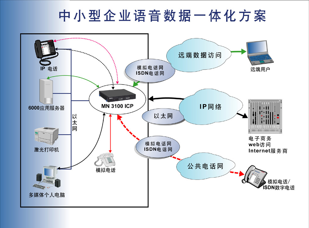 商務(wù)電話系統(tǒng)、本地網(wǎng)和網(wǎng)關(guān)集成在統(tǒng)一的平臺(tái)上?敏迪網(wǎng)絡(luò)推出的MN3100綜合通信平臺(tái)就是這樣簡單快捷的滿足您的需要,它是專為小型企業(yè)或大型企業(yè)的分支機(jī)構(gòu)而設(shè)計(jì)的語音數(shù)據(jù)集成的解決方案。