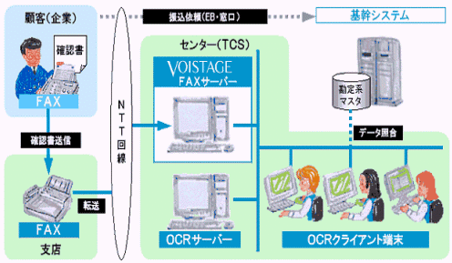 系統(tǒng)結(jié)構(gòu)中心每天收到FAX7~800張?蛻魯(shù)約 1,400家。系統(tǒng)配置是有VOISTAGE(VS-403MC)功能的FAX服務(wù)器和OCR