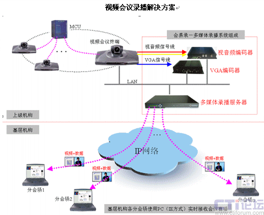 如圖所示,上級機構視音頻編碼器接在視音頻源上,對視音頻信號采集,VGA編碼器采集VGA信號,通過網絡傳給放在機房的多媒體錄播服務器。基層機構的各個分會場通過IE瀏覽器的方式接受會議直播。