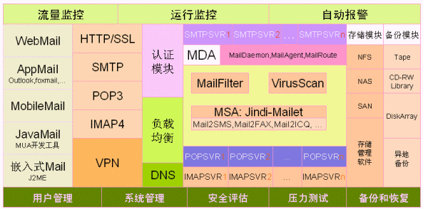 1. 郵件集群系統(tǒng)由二個(gè)smtp server、一個(gè)pop3/imap server、一個(gè)認(rèn)證服務(wù)器ldap、和磁盤(pán)陣列組成。監(jiān)控中心由流量監(jiān)控、運(yùn)行監(jiān)控、SMS報(bào)警、系統(tǒng)管理、查詢運(yùn)維終端組成。