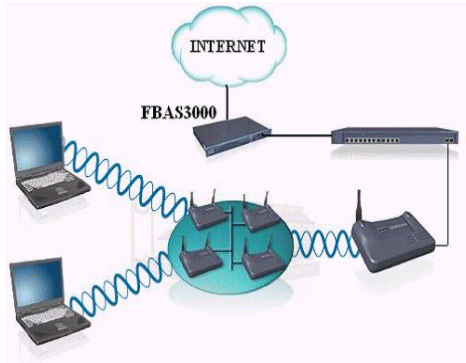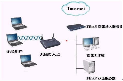 移動用戶通過自身的無線網(wǎng)卡傳遞信息到熱點接收器上,熱點接收器連接到交換機(是為了能具有更好的可拓展性),交換機連接到華夏科技FutureWorks寬帶計費系統(tǒng)的FBAS接入服務器上,通過接入服務器連接到INTERNET.這里的FBAS3000系列的寬帶接入服務器采用的是一體機的模式,接入,認證,計費等一系列服務均安裝在FBAS里,這樣可以簡化網(wǎng)絡結(jié)構(gòu)。對FBAS的操作是通過WEB頁面來進行設置維護的,