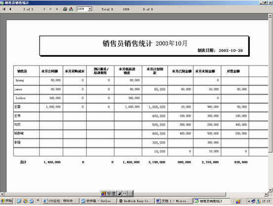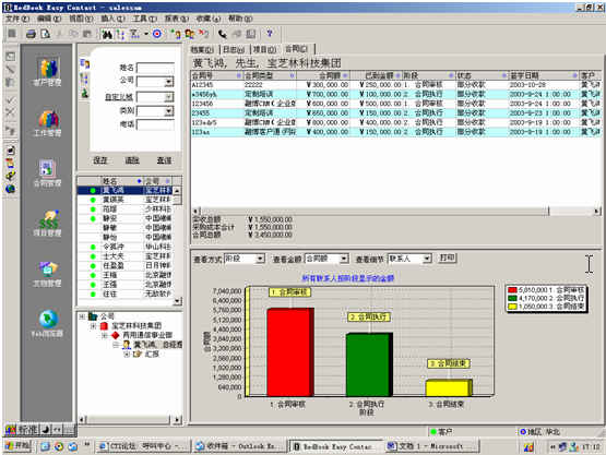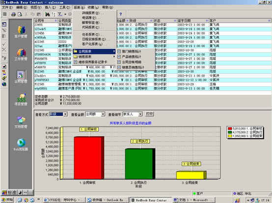 可對(duì)客戶(雇員)合同,根據(jù)合同階段、月份、合同金額、合同應(yīng)收應(yīng)付款、采購成本、客戶、銷售人員等條件進(jìn)行查詢和統(tǒng)計(jì), 查詢統(tǒng)計(jì)結(jié)果以詳細(xì)列表及圖示進(jìn)行顯示。