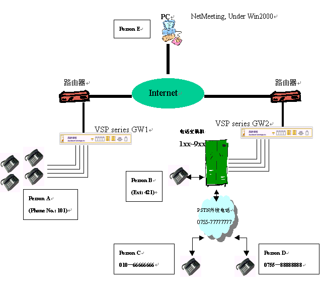 1、 兩臺語音網關,分別為 GW1 和GW2,與另外一臺電腦同時連接在internet上。