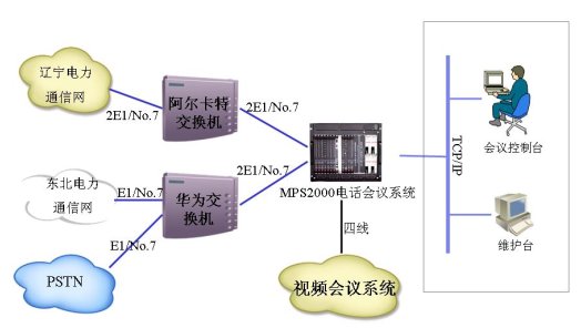 東北電網(wǎng)公司的電話會議系統(tǒng)中的120方會議橋通過4個E1采用中國七號信令與其原有的PABX相連,同時會議橋通過以太網(wǎng)與公司的內(nèi)部局域網(wǎng)相連,并在局域網(wǎng)內(nèi)設(shè)置一臺維護(hù)終端用于對系統(tǒng)的維護(hù)管理,局域網(wǎng)內(nèi)另一臺計算機可作為會議控制臺。電話會議終端直接與PABX相連。
